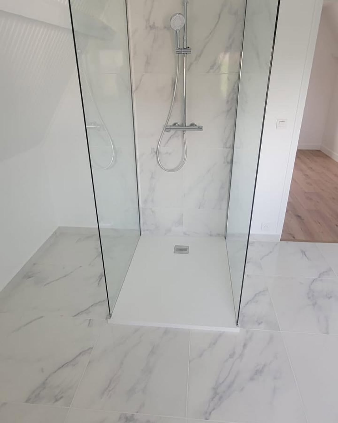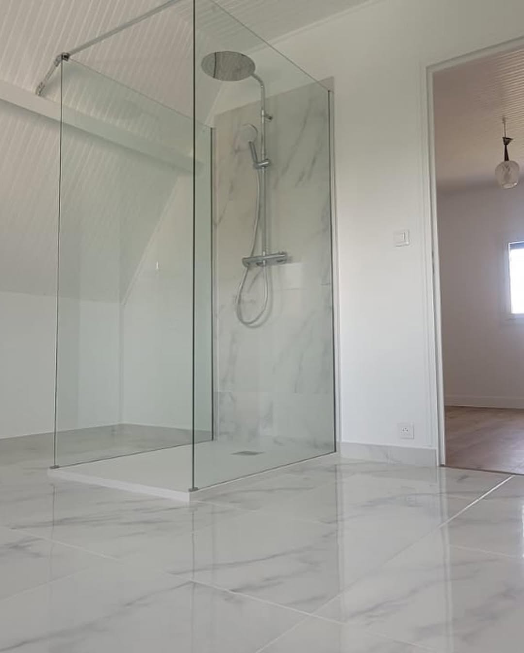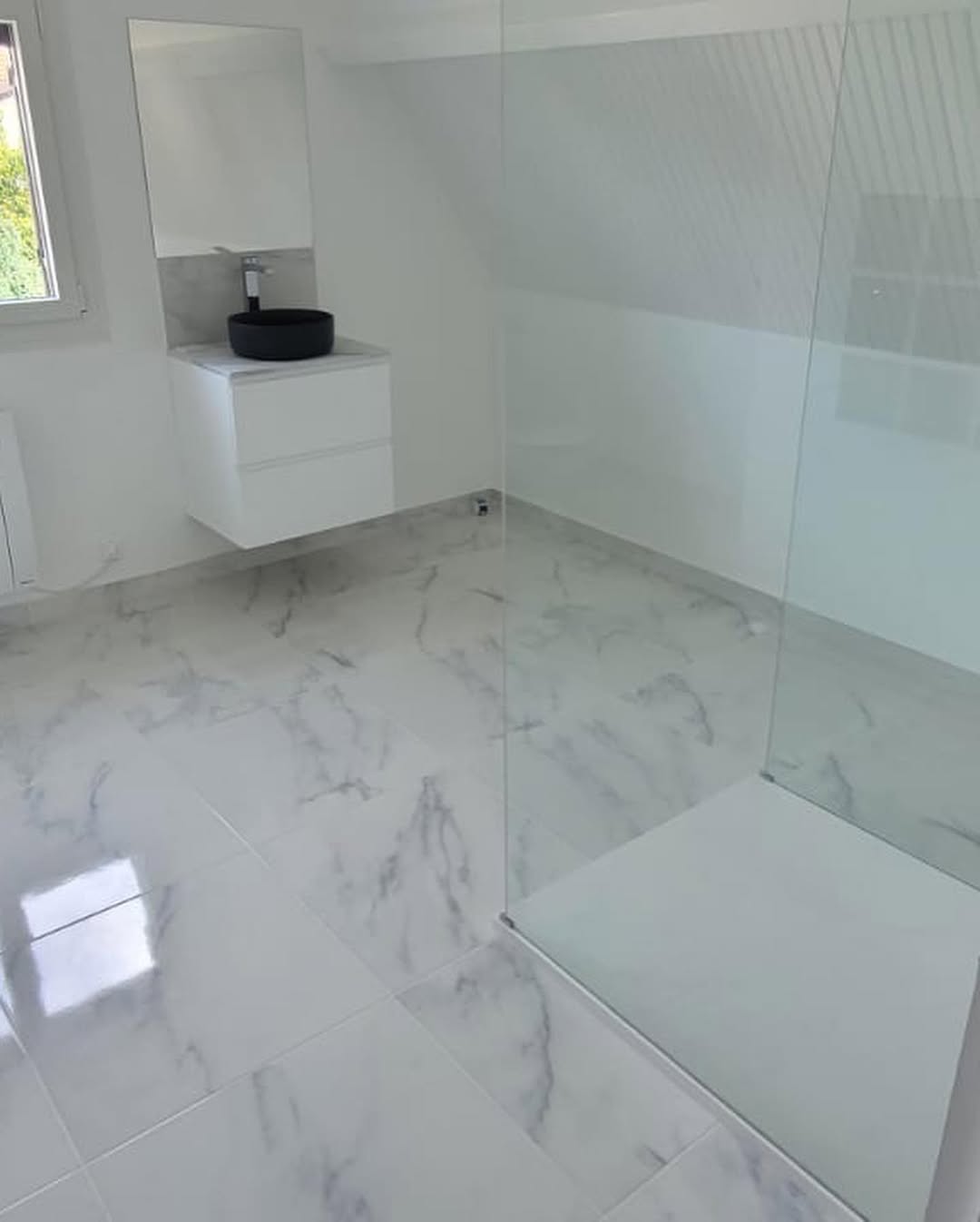 Le choix du carrelage effet marbre pour les murs et le sol apporte à la fois raffinement et clarté à la pièce, tout en offrant une grande facilité d’entretien.